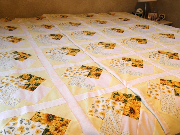 ★★★ This past week I've been stitching away at my king size quilt. I am not even half-way done at this point-the point where I've left off. If you remember, I had to sew on these annoying little triangles before I could sew the lattice to the block. Here are the finished blocks with all of their yellow triangles. I wanted to lay out all the blocks so I could see my most crappy sewing and then hide it (by rearranging square layout) as best that I could.